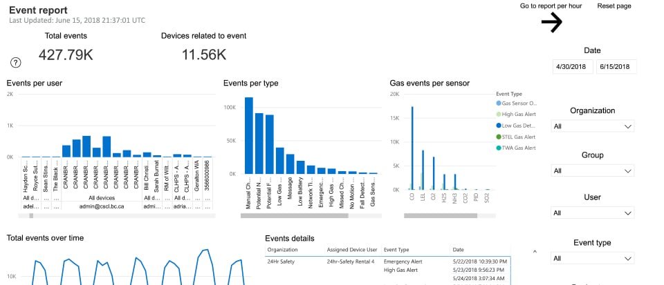 Este informe ofrece una visión general de alto nivel de todos los datos recopilados por una flota de detectores de gas G7 en el campo. Los equipos pueden profundizar en la información utilizando una serie de filtros para ver la información que les interesa, incluyendo eventos por usuario, grupo, organización, tipo de datos e incluso variedad de sensores de gas. El informe muestra las tendencias de los datos a lo largo del tiempo para que las empresas puedan supervisar cómo utilizan los empleados los equipos de detección de gas, mantenerlos en buen estado de funcionamiento e identificar fácilmente las áreas de posible optimización.